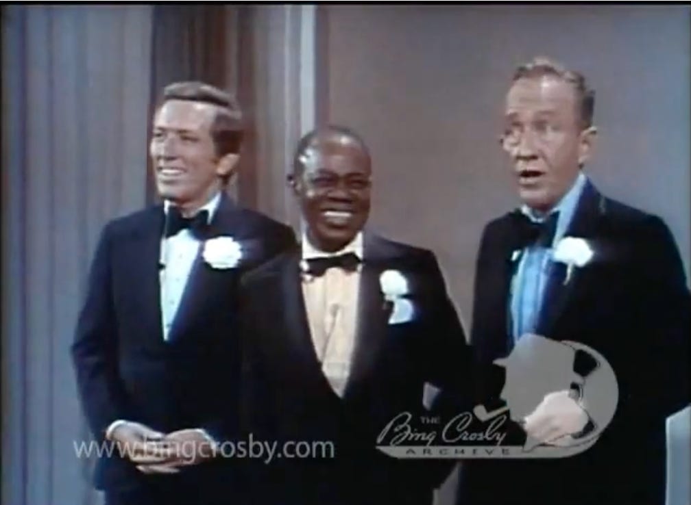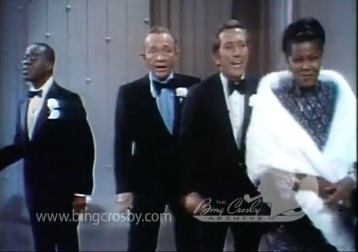 My first guest is the philosopher and author Justin Smith-Ruiu. Many of you already subscribe to Justin’s newsletter The Hinternet, which gets described in many ways (because it is hard to describe) including, on its ‘About’ page, as a “fictional magazine.” It’s at least as likely to cover Siberian epic poems or the case for horse telepathy as it is to talk about TV performances by major celebrities. Nonetheless Justin chooses a seven-minute YouTube video of Louis Armstrong and Bing Crosby performing on The Pearl Bailey Show, a primetime variety show of a kind whose days were very much numbered by then. It was originally broadcast, on the ABC TV network, on Saturday 23 January 1971.
